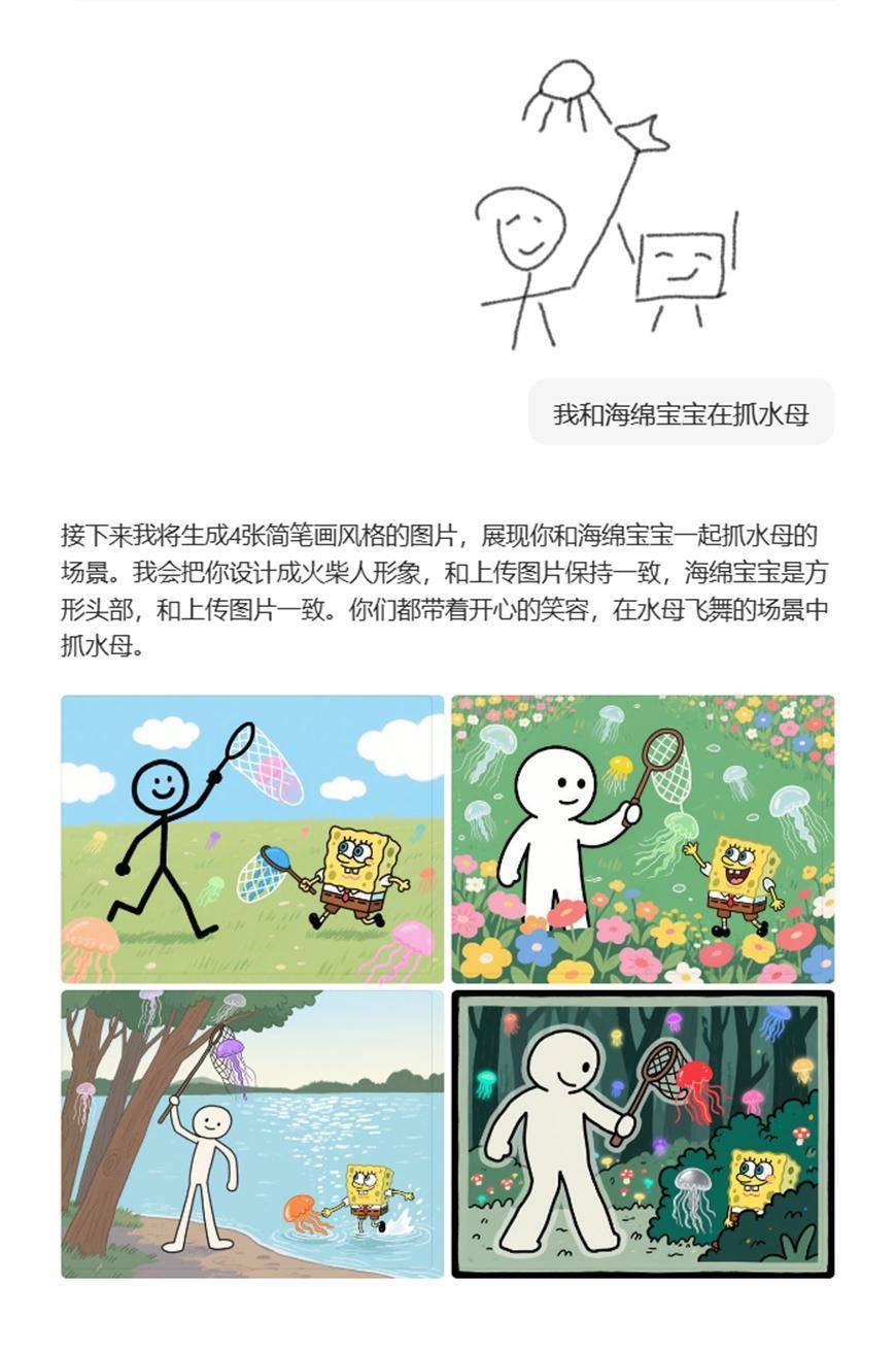 或者手绘一张图,告诉他画面,他也能帮你补全: