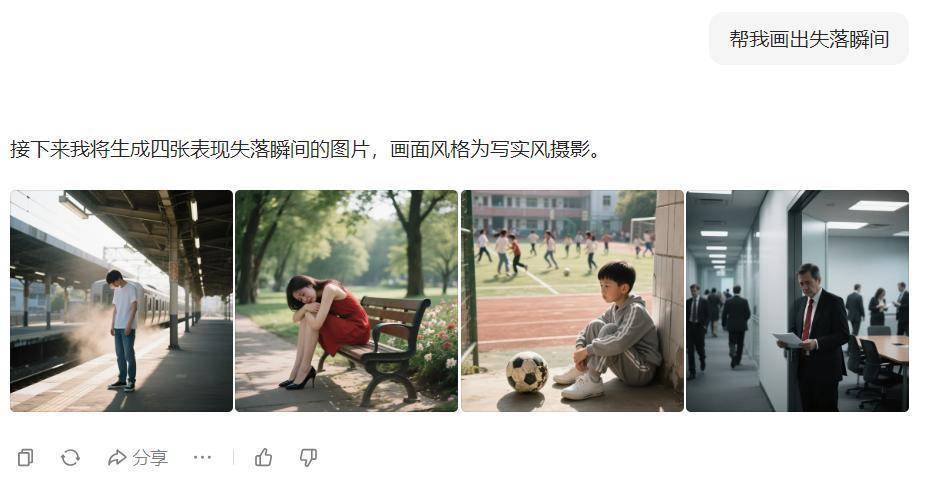 只是告诉他,画出失落瞬间,不用给到详细描述词,他会自动补全画面风格,并生成对应画面: