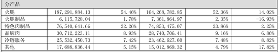 金字火腿的营业收入主要来自于火腿、特色肉制品等商品的销售。2024年度,金字火腿公司的营业收入为3.44亿元,其中火腿业务的营业收入为人民币1.87亿元,占营业收入的54.46%,特色肉制品业务的营业收入为人民币0.77亿元,占营业收入的22.26%。