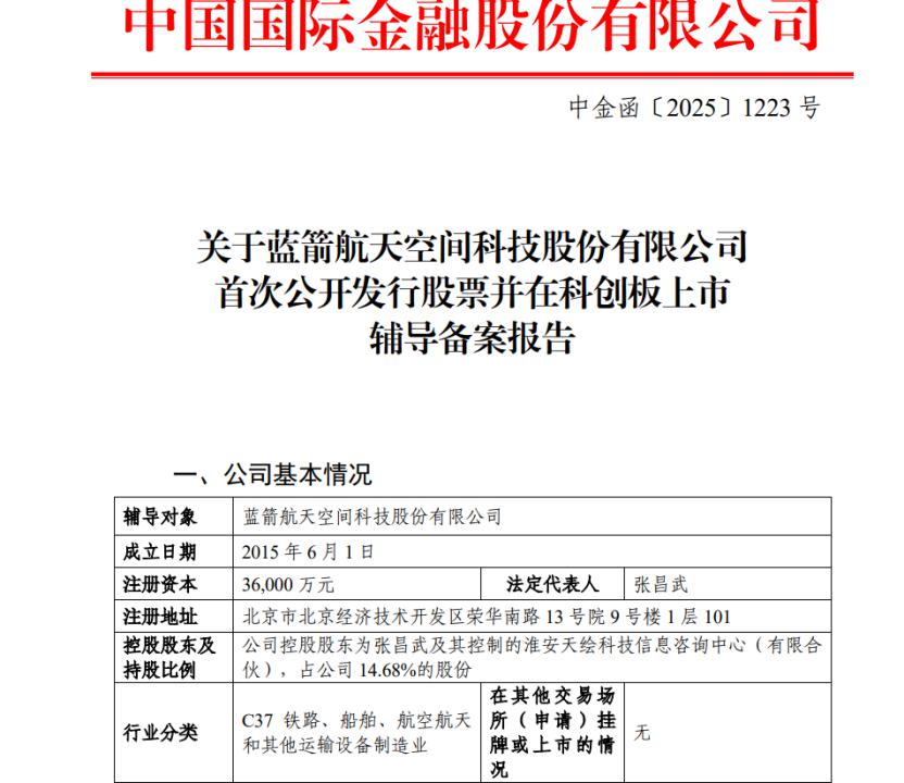7月30日,证监会官网信息显示,蓝箭航天空间科技股份有限公司(以下简称“蓝箭航天”)已启动上市辅导,拟在科创板上市,由中金公司(601995)担任辅导机构。