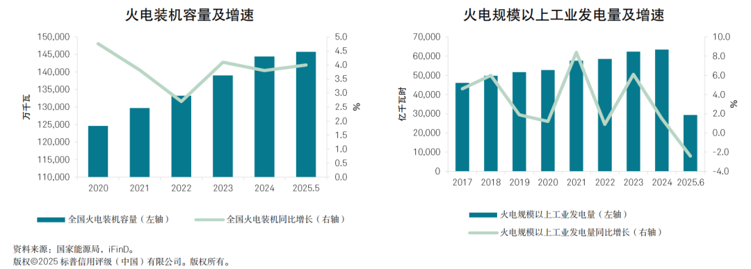 我们预计,2025年下半年,火电的装机容量仍将保持小幅增长,但其装机增速远远落后于风光发电,迎峰度夏及迎峰度冬将对火电出力形成支撑,但火电在我国发电量中的占比将进一步下降。需求方面,2024年及2025年1-5月,我国全社会用电量分别同比增长6.8%和3.4%。我们预计,2025年全社会用电量将保持温和增长,增速约5%-6%,下半年受季节性需求支撑用电量增幅将较高于上半年。供给方面,2025年5月末,全国发电装机容量同比增长18.8%,其中火电增速为4%;上半年,全国规模上工业发电量同比增长0.8%,受新能源装机增长挤压,火电规模以上工业发电量同比下降2.4%。根据国务院印发的《2024-2025年节能降碳行动方案》,到2025年底,全国非化石能源发电量占比将达到39%左右,这意味着火电的发电量占比将降至61%左右,2025年上半年,火电在规模以上工业发电量中的占比为65%,仍有下降空间。